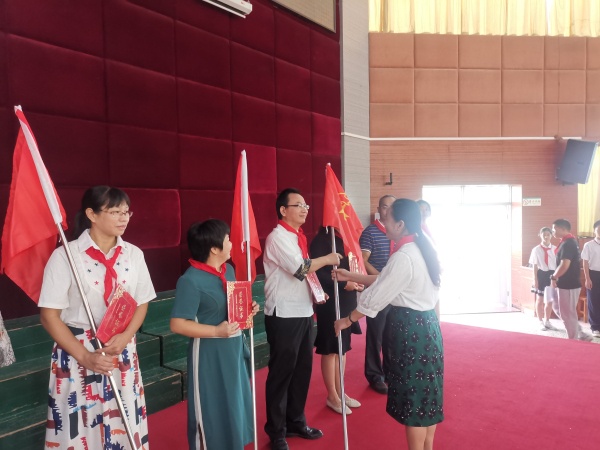 接下來,根據(jù)少先隊(duì)組織建設(shè)的有關(guān)規(guī)定,大隊(duì)輔導(dǎo)員周嘉杰老師宣讀了初一級(jí)建隊(duì)決定,公布了所聘任的中隊(duì)輔導(dǎo)員名單。學(xué)校少工委副主任廖建紅親自為各中隊(duì)輔導(dǎo)員授中隊(duì)旗與頒發(fā)聘書。八個(gè)中隊(duì)輔導(dǎo)員老師接過中隊(duì)旗和聘書后,紛紛表示增強(qiáng)了使命感,感受到學(xué)校領(lǐng)導(dǎo)對(duì)少先隊(duì)中隊(duì)輔導(dǎo)員老師的殷切期望。