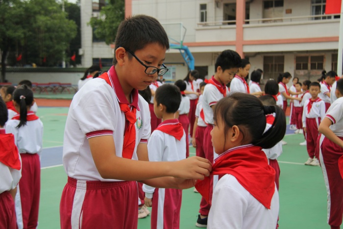 學校部分高年級隊員代表為新隊員佩戴紅領巾。隨后,大隊委在隊旗下帶領新隊員宣誓,新隊員面向少先隊隊旗莊嚴地宣誓。鮮艷的紅領巾映著新隊員的張張笑臉,全體新少先隊員對能加入到少先隊這個大集體里感到無比驕傲自豪。