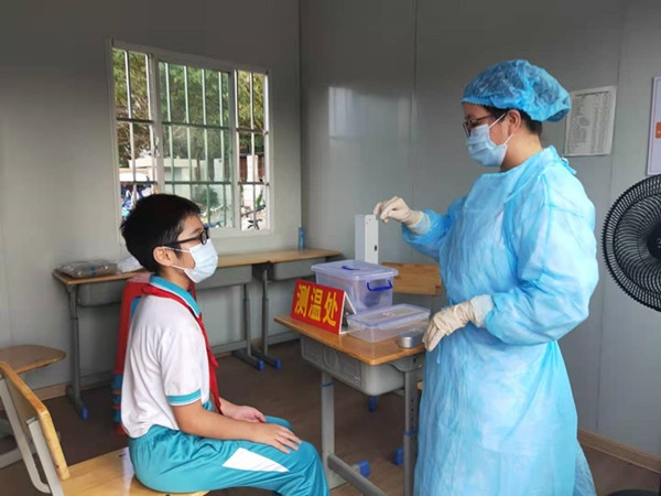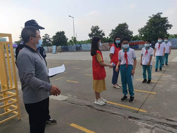演練內(nèi)容為學(xué)生在校門(mén)口測(cè)溫發(fā)現(xiàn)異常及應(yīng)急處置。在演練中,學(xué)生間隔一米排隊(duì)入園。進(jìn)班前由班主任對(duì)所在班級(jí)學(xué)生進(jìn)行晨午檢,并做好晨午檢記錄,病因追蹤報(bào)告及復(fù)課證明查驗(yàn)等日常工作。在通過(guò)學(xué)校門(mén)口測(cè)溫時(shí),測(cè)溫教師發(fā)現(xiàn)其中一名學(xué)生體溫異常,該教師立刻把該學(xué)生帶到臨時(shí)觀察點(diǎn)并讓校醫(yī)再次對(duì)該學(xué)生進(jìn)行測(cè)溫。校醫(yī)水銀體溫計(jì)核實(shí)體溫,詢問(wèn)并登記該生在14天內(nèi)有無(wú)疫情重點(diǎn)地區(qū)旅游史、途徑史,有無(wú)確診、疑似病例接觸史。囑咐家長(zhǎng)到醫(yī)院就醫(yī)。隨后,學(xué)生被家長(zhǎng)接回,后勤人員到觀察室進(jìn)行消毒。通過(guò)各個(gè)小組的相互配合,演練有序進(jìn)行,行動(dòng)迅速,有效強(qiáng)化了師生安全意識(shí)和應(yīng)急避險(xiǎn)及疏散能力。