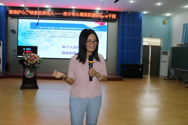 她結(jié)合科學數(shù)據(jù)讓教師們認識青少年的心理健康狀況,從中山市中小學生心理健康狀況、令人關(guān)注的青少年心理健康問題案例、心理危機預警信號出發(fā),深入淺出的分析和講解,強調(diào)要做好學生的普訪,及時掌握學生動態(tài)。