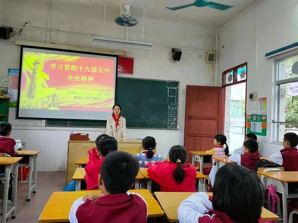 為深入學(xué)習(xí)貫徹習(xí)近平總書記在黨的十九屆五中全會(huì)重要講話精神和全會(huì)精神,以及總書記出席深圳經(jīng)濟(jì)特區(qū)建立40周年慶祝大會(huì)和視察廣東重要講話、重要指示精神,聚焦培養(yǎng)擔(dān)當(dāng)民族復(fù)興大任和時(shí)代新人,根據(jù)《廣東共青團(tuán)學(xué)習(xí)宣講貫徹黨的十九屆五中全會(huì)精神方案》《關(guān)于開(kāi)展廣東省中小學(xué)“燈塔工程·廣東學(xué)子宣講黨的十九屆五中全會(huì)精神”實(shí)踐活動(dòng)的通知》和《“燈塔工程”·廣東學(xué)子宣講黨的十九屆五中全會(huì)精神實(shí)踐活動(dòng)指引》要求,2020年12月14日,黃圃鎮(zhèn)石軍小學(xué)少工委開(kāi)展宣講黨的十九屆五中全會(huì)精神活動(dòng)。