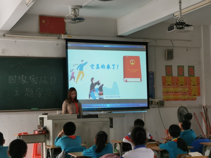 首先,通過晨會、主題班會、紅領(lǐng)巾廣播站、小視頻等多種形式在校園內(nèi)營造了濃厚的法制教育和學(xué)習(xí)憲法、民法典相關(guān)知識的氛圍;并以班級為單位召開了“國家憲法日”主題班會。主題班會上,同學(xué)通過觀看視頻,了解什么是憲法、憲法的產(chǎn)生、作用等知識,老師結(jié)合身邊的例子,讓學(xué)生從實際生活中感受憲法的作用。