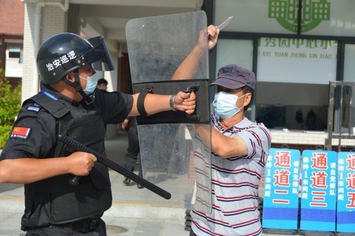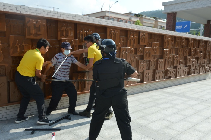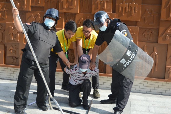 演練開始,校門外一名暴恐分子假稱學(xué)生家長(上課時間不允許探望)探望小孩為由無視保安的勸阻,強行闖入校區(qū)并掏出兇器,尋機準(zhǔn)備傷害學(xué)生。一名保安迅速戴頭盔持戰(zhàn)術(shù)盾牌、橡膠棍、趕到現(xiàn)場,阻止犯罪分子向?qū)W生集中處靠近,把同學(xué)保護在身后,與犯罪分子對峙,同時喊話“放下武器,不要闖入校區(qū)傷害學(xué)生?!绷硪幻0舶聪隆耙绘I式報警器”并撥通校防暴反恐組組長電話報告情況。應(yīng)急小組即刻報告校長,啟動應(yīng)急預(yù)案,全體師生開始迅速往安全區(qū)域逃離。各班老師立即將教室的門、窗戶關(guān)緊上鎖,并保護孩子躲避到安全區(qū)域。防暴反恐組接到警報后,手持“長柄的防暴叉”、“警棍”等武器從四周沖向“歹徒”,實行截堵,并與“歹徒”周旋。經(jīng)過搏斗,最終成功將“歹徒”制服,押送派出所處理。