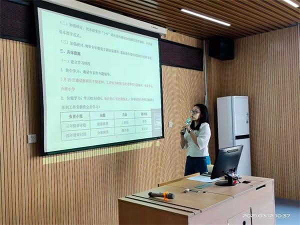 會(huì)議開始,主持人朱殷沂老師對(duì)本年度工作室的工作計(jì)劃進(jìn)行了詳細(xì)的解讀。朱老師針對(duì)本鎮(zhèn)英語閱讀教學(xué)的具體情況,對(duì)工作室的成員進(jìn)行了具體詳細(xì)的分工,初步探索“1+N”課內(nèi)與課外相結(jié)合的閱讀教學(xué)策略,提高課內(nèi)與課外閱讀教學(xué)的結(jié)合度,其中提到要建立年級(jí)研討小組并且成立實(shí)驗(yàn)班,對(duì)學(xué)生情況進(jìn)行摸底檢測(cè)。