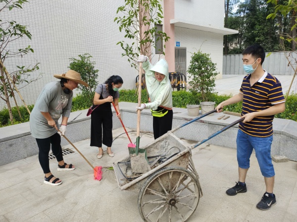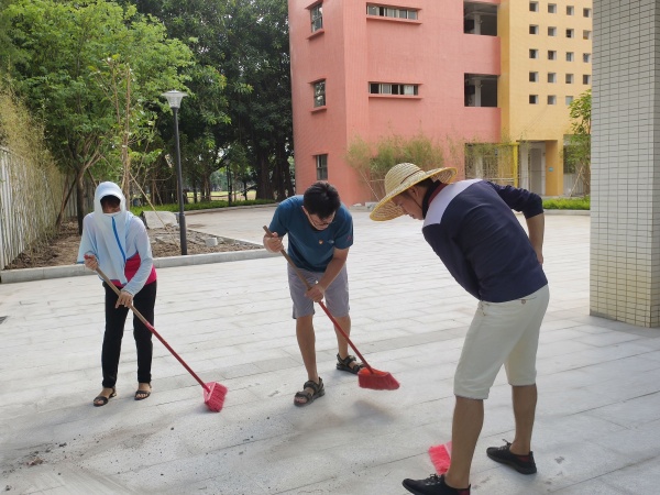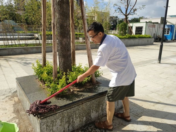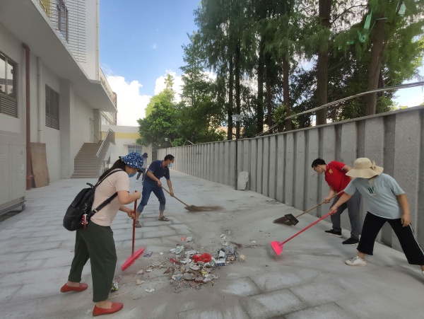 行動(dòng)中,烈日當(dāng)空,炙烤著大地,教師們面對(duì)校園景觀改造工地地面塵土堆積,碎石隨處可見(jiàn),生活垃圾隱匿角落的景象沒(méi)有就此退縮,反而熱情高漲,手拿大掃帚,扛著大鐵鏟,推著斗車,興致勃勃地投入到清潔行動(dòng)中。為了把塵土堆積的地面進(jìn)行徹底地清潔,有的教師拿著水管來(lái)沖刷,有的教師拿著拖把來(lái)清理;為了把隱匿在空調(diào)主機(jī)背后的生活垃圾,盧新泉校長(zhǎng)用未戴手套的雙手清理垃圾,在盧校長(zhǎng)的率先垂范下,幾位初一級(jí)老師紛紛用手把垃圾清理干凈,充分發(fā)揮了不怕累、不怕臟的精神;他們?nèi)绱苏J(rèn)真地清潔,如此勤懇地付出,是因?yàn)榘褜W(xué)校當(dāng)做家呀!即便是揮汗如雨,依舊義無(wú)反顧,教師們的行動(dòng)保證了校園各個(gè)角落干凈整潔。