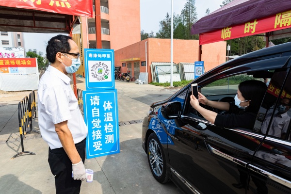 學校大門是校園疫情防控的第一道防線,故演練拍攝首先從學生進入校門開始。校門口拍攝包含了三個場景,一是學生戴口罩,按要求進行排隊,由教師測量體溫。二是有學生出現(xiàn)體溫異常,送至隔離區(qū),由校醫(yī)進行復檢。三是學校老師或外來人員進入學校前進行粵康碼的掃描。為了呈現(xiàn)良好效果,需要不斷重復,但是,“學生”毫無怨言,只希望能為順利復學盡自己一份力。