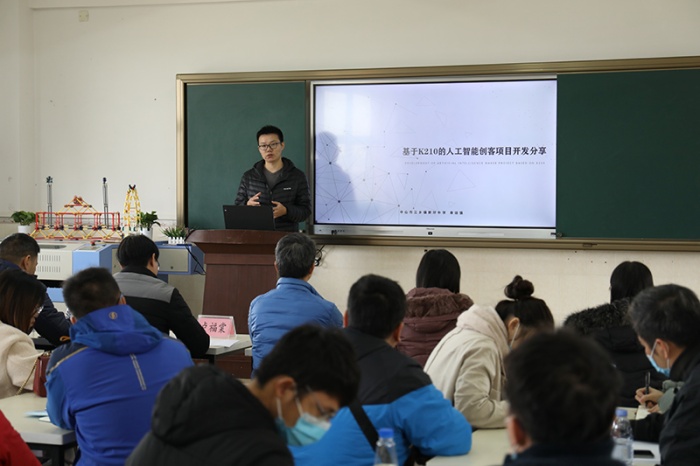 第二部分是創(chuàng)客教育案例和科創(chuàng)教育經(jīng)驗(yàn)分享,首先由張劍杰老師從自身成功的實(shí)踐經(jīng)歷出發(fā),分享了創(chuàng)客作品的開發(fā)與制作策略,指導(dǎo)大家不僅在平時(shí)的教育教學(xué)中要善于記錄和保存靈感,學(xué)會(huì)在巨人的肩膀上尋求創(chuàng)新,還要不斷學(xué)習(xí)新技術(shù)來(lái)拓寬制作手段。一個(gè)完美的創(chuàng)客作品,是創(chuàng)意、技術(shù)、外觀的統(tǒng)一體。隨后由袁運(yùn)強(qiáng)老師分享的是基于K210的人工智能創(chuàng)客項(xiàng)目的開發(fā)。袁老師以案例作品分析為載體,深入淺出地幫助大家認(rèn)識(shí)選擇K210的優(yōu)勢(shì)和運(yùn)用K210進(jìn)行人工智能教學(xué)的軟件支持,為未來(lái)的創(chuàng)客教育拓寬了前進(jìn)的道路。最后練海燕老師則從學(xué)校的角度,分享了科創(chuàng)教育的豐富經(jīng)驗(yàn)。通過(guò)分享,大家都了解到,新圩小學(xué)學(xué)校非常重視科創(chuàng)教育,無(wú)論在硬件配備還是專業(yè)師資隊(duì)伍建設(shè)都是高標(biāo)準(zhǔn)、嚴(yán)要求的。該??苿?chuàng)之所以能有效扎實(shí)地推開,一方面得益于利用課堂、活動(dòng)、社團(tuán)等全面開展,形成人人參與的科創(chuàng)氛圍,另一方面借助課題研究來(lái)提升科創(chuàng)教育的深度和廣度,帶動(dòng)學(xué)校其他工作的全面開展。