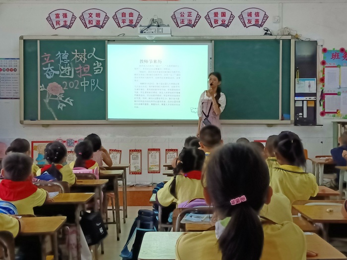 “老師我感謝您,您像一把金鑰匙,把無知的我們領進知識的寶庫。”“您那如嚴父般的教誨和慈母般的關愛,時刻溫暖著我們?!?“教師是火種,點燃了學生的心靈之火;教師是石級,承受著學生一步步踏實地向上攀登?!薄且痪渚涓腥朔胃恼Z言更是讓老師們刻骨銘心。9月9日團隊會課上舉行“立德樹人,奮進擔當”做有情懷的教師主題隊會。同學們積極發(fā)言,說出自己心中最“美”的老師;熱烈討論:如果自己以后成為老師,要怎樣做一名奮進擔當的好老師。最后,當學生把賀卡和征文送給老師,當學生在教室進行《每當我走過老師窗前》大合唱的時候,老師情不自禁流下了幸福的熱淚。