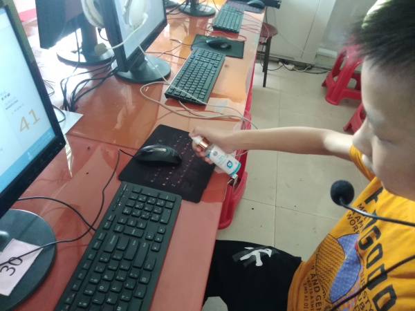 考前兩周,后勤處對電腦房進(jìn)行了集中消毒。同時為電腦房配置了消毒酒精,每使用一次電腦,就用噴霧酒精對鍵盤、鼠標(biāo)、耳麥進(jìn)行一次消毒。為了防止聚集,按電腦機(jī)位容量的50%安排學(xué)生數(shù),隔位就座。在開空調(diào)的同時,又打開電腦房兩邊的窗戶通風(fēng)。最大限度的防止學(xué)生交叉和聚集。
