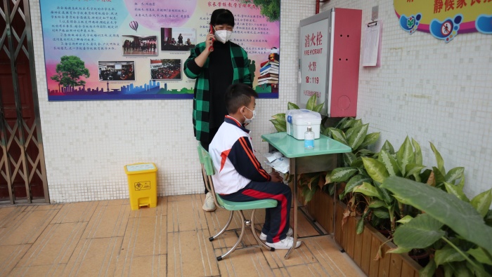 應(yīng)急演練有條不紊地進(jìn)行著,大課間期間,四(2)班有一名同學(xué)身體不舒服,感覺胸悶,任課老師馬上處理,班主任告知安全主任潘杰,潘杰主任到現(xiàn)場處理,班主任打電話通知該生家長,潘杰主任打電話石岐疾控中心聯(lián)系人匯報情況,四1班其它學(xué)生疏散至學(xué)校達(dá)人堂,進(jìn)行體溫篩查,與四(2)班相鄰的班級開展體溫篩查,校工阿姨徹底對教室進(jìn)行消毒,家長到校測溫,接走孩子,并到發(fā)熱門診就醫(yī),并主動把檢查結(jié)果報告鄭結(jié)霞校長或者潘杰主任。