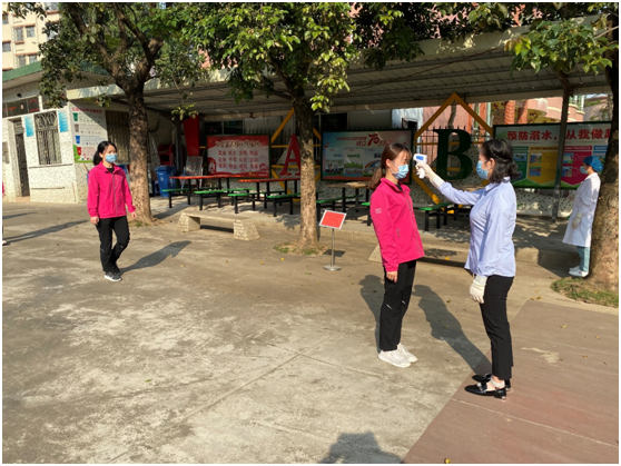 入校晨檢,安全有序。進(jìn)校測溫是學(xué)校日常防控疫情工作第一站,本次演練就學(xué)校校門開放、校外馬路的實際情況部署教職工把好這一道安全門檻。為確保學(xué)校入校前不發(fā)生擁堵、扎堆、聚集等情況,校門口由安保人員和一位值班教師組織學(xué)生排好序列隊伍,每生之間間隔1.5米的安全距離,一個值日教師進(jìn)行體溫檢測,當(dāng)檢測學(xué)生體溫出現(xiàn)異常時,在無接觸情況下,馬上將學(xué)生安全帶至臨時隔離室,由校醫(yī)詢問具體情況,并將情況通知班主任及主管行政進(jìn)行逐層上報,通知家長接回學(xué)生到醫(yī)院就診。