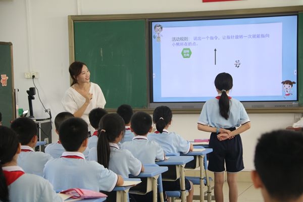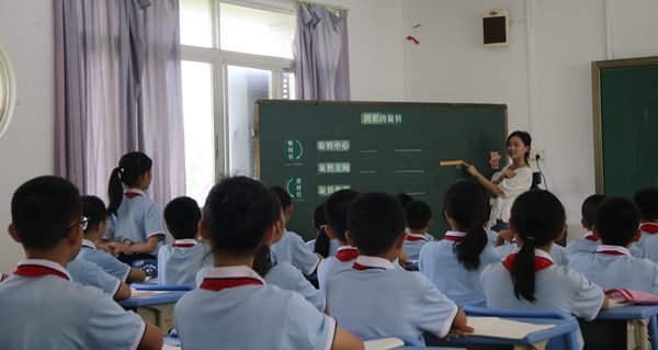 首先,胡柳老師和五(2)班學(xué)生上了一節(jié)《圖形的旋轉(zhuǎn)》。胡老師通過生活中的旋轉(zhuǎn)現(xiàn)象:例如鬧鐘的時針,風(fēng)扇、風(fēng)車的轉(zhuǎn)動,旋轉(zhuǎn)木馬的旋轉(zhuǎn)等等,引入新課——圖形的旋轉(zhuǎn)。課件上出示了一根指針和一只小熊,胡老師提問:“哪位同學(xué)能說出明確的指令,使指針一下子指向小熊?”進(jìn)而引出旋轉(zhuǎn)的三要素,旋轉(zhuǎn)中心,旋轉(zhuǎn)方向,旋轉(zhuǎn)角度。課堂上學(xué)生踴躍回答,學(xué)習(xí)氣氛濃厚,語言表達(dá)也很清晰。整節(jié)課時間把握得當(dāng),教學(xué)環(huán)節(jié)設(shè)計合理,獲得了大部分老師的好評。