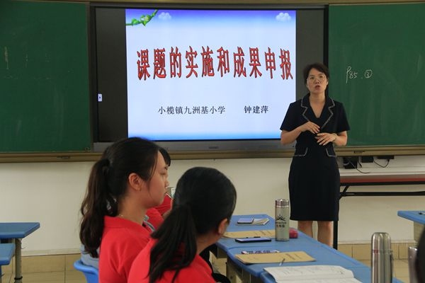 隨后,鐘建萍老師為老師們帶來了《課題的實施和成果申報》的講座。鐘老師詳細(xì)介紹了課題的實施需要注意哪些問題,要將日常的教學(xué),與科組教研,課題研討聯(lián)系起來。課程的成果內(nèi)容有哪一些,要做好詳細(xì)計劃,在課題研究過程中一一展現(xiàn)出來。在平時要注意收集過程性的資料,比如:培訓(xùn)資料,活動圖片,教學(xué)設(shè)計,教育教學(xué)論文,教學(xué)反思,聽課意見等等。整個講座讓在座老師對課題的研究與實施有了更深層次的理解,受益匪淺。