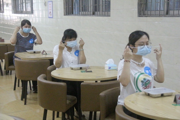 第五場景為午餐、午休, 送餐公司會把午餐配送到教室門口,放學(xué)鈴聲一響,正副班主任到班級,副班主任先引導(dǎo)不開餐的同學(xué)排隊放學(xué)。然后正班主任引導(dǎo)開餐的同學(xué)測溫、排隊洗手,洗完手后排隊回課室旁領(lǐng)餐盒,回到指定就餐座位,開始用餐。學(xué)生用餐完畢后,把餐盒放在桌面,坐在原座位。反折口罩并裝在左口袋,從右口袋取出口罩換上。排隊把餐具放到指定位置再去洗手消毒。