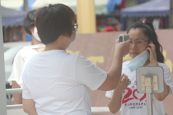 第一場景為師生晨檢管理,設(shè)置入校通道標識、隔離樁,學(xué)生間隔1米以上有序4列站隊、等候入校,由值勤領(lǐng)導(dǎo)、老師和保安組成護導(dǎo)隊,提醒學(xué)生保持安全距離。師生完成體溫檢測以后,前往入校消毒處,排成4條隊伍,前后左右間隔 1 米,有序進行雙手消毒并有序排隊進入校園。實行對在校學(xué)生進行一日兩次的健康追蹤,上午入校、下午餐入校分別進行一次健康狀況登記,在校午餐的師生則在各班課室進行測溫。 體溫超過36.8?C的同學(xué)跟隨老師去到臨時觀察點進行腋下體溫復(fù)查,校醫(yī)進行問診和詢問流行病學(xué)史。