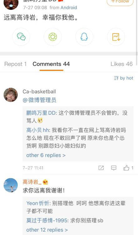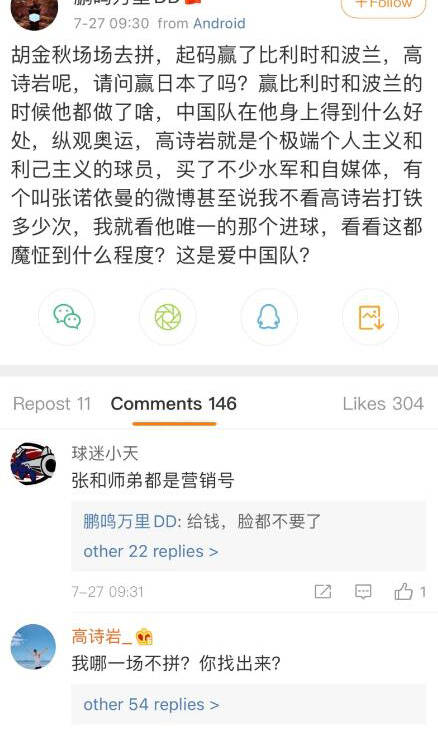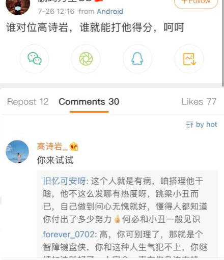 有網(wǎng)友在社交媒體發(fā)表了對高詩巖不滿意的評論,高詩巖則是親自下場在評論區(qū)回懟網(wǎng)友,評論區(qū)也有不少高詩巖的球迷來維護自己的偶像。