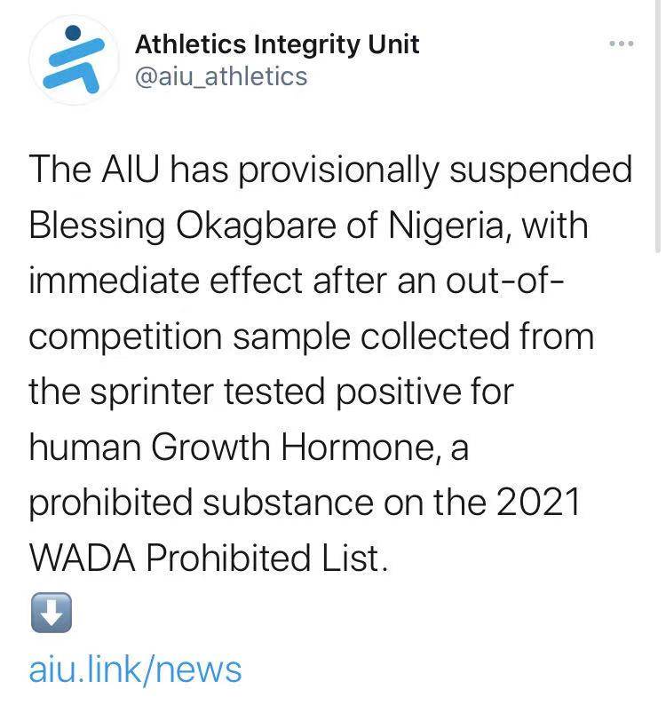 來(lái)自尼日利亞的奧卡巴雷,是一位32歲的田徑短跑運(yùn)動(dòng)員,身高1.8米。田徑誠(chéng)信部門(mén)表示,這項(xiàng)賽外測(cè)試是在7月19日進(jìn)行的,奧卡巴雷在周六早晨收到了檢測(cè)結(jié)果通知,而她在前一日的女子100米比賽中晉級(jí)。另外,奧卡巴雷原計(jì)劃將參加7月31日晚間進(jìn)行的東京奧運(yùn)會(huì)女子100米半決賽。