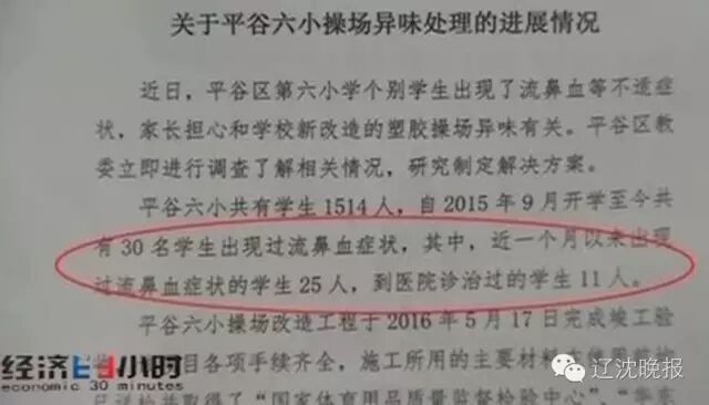 無奈之下,記者帶著這些疑問,找到了北京市平谷區(qū)教委,詢問具體的緣由,在6月14日,北京市平谷區(qū)教委向記者提供了這樣的一份文件,關(guān)于平谷六小操場異味處理的進展情況。在這份文件當(dāng)中,平谷區(qū)教委確認(rèn),近一個月以來平谷區(qū)第六小學(xué)出現(xiàn)過流鼻血狀況的學(xué)生有25人,到醫(yī)院診治過的學(xué)生達(dá)到了11人。