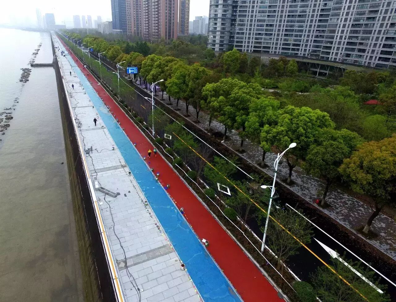 “昨天我已經(jīng)跑過一次,感覺真不錯。今天晚上我們跑團(tuán)還會去試跑,這么好的跑道,整個杭州也找不出第二條。”杭馬會濱江分會資深跑友周卞說,以前在步行道上跑,一要避讓行人,而且地面是用小地磚鋪的,跑起來感覺不太舒服;如果在柏油路上跑,要躲避的是機動車,很不安全,“現(xiàn)在人車分離很安全,而且又是塑膠跑道,跟體育場里跑完全一樣,可以避免受傷。跑起來一邊是江景,另一側(cè)是綠化的花花草草,實在太美了。”