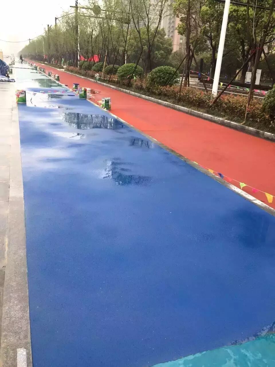 回彈指標(biāo)也比規(guī)定標(biāo)準(zhǔn)領(lǐng)先。所以搶鮮體驗的跑友說,踩上去軟軟的,腳感超好!整個跑道由底層、發(fā)泡層、加強層、保護(hù)層等組成,要涂上9至11遍才完工。自行車道現(xiàn)在用的是和快速公交道一樣的雙組份材料,騎行時舒適感不錯,還防滑。”