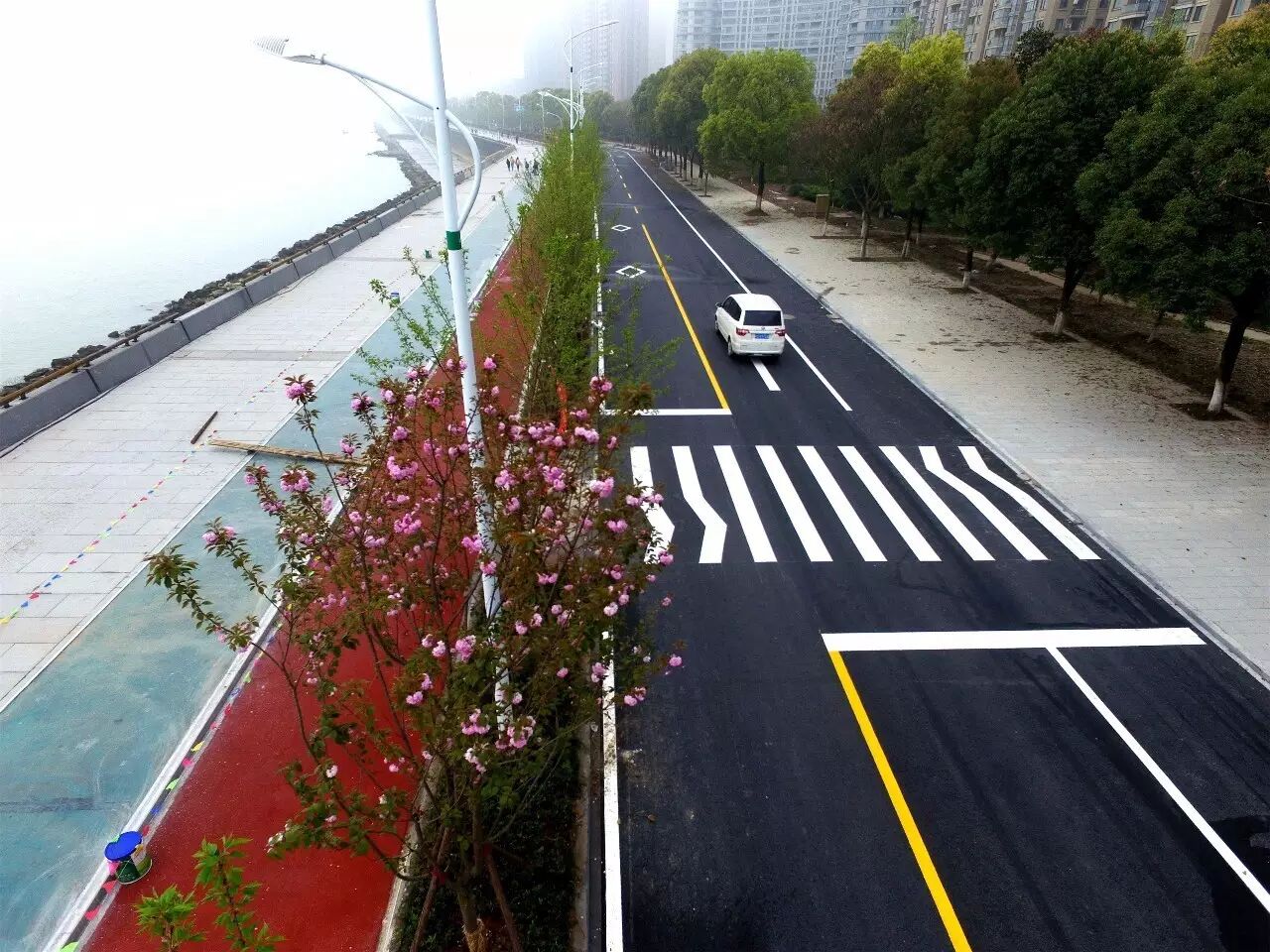跑步道是藍(lán)色的,寬2.5米,自行車道是紅色的,寬3米,而綠化帶以南的機動車道被加寬后改成雙向通行。