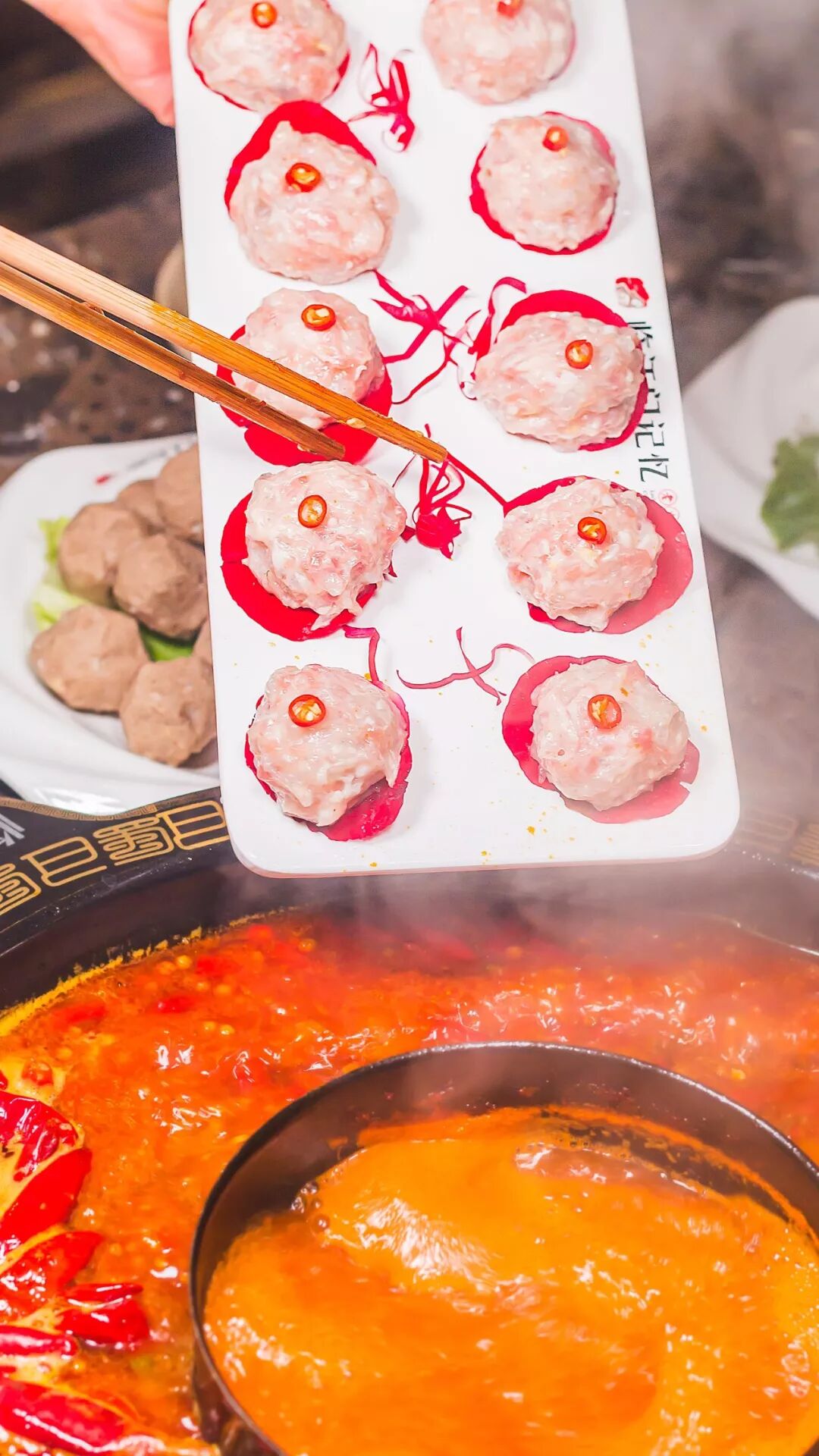 玫瑰花瓣包裹著丸子。然后用料極具匠心,丸子采用新鮮食用玫瑰、豬肉純手工打制成的丸子!關(guān)鍵是口感很舒服,在吸收鍋底麻辣之余還能吃出一縷玫瑰的花香。
