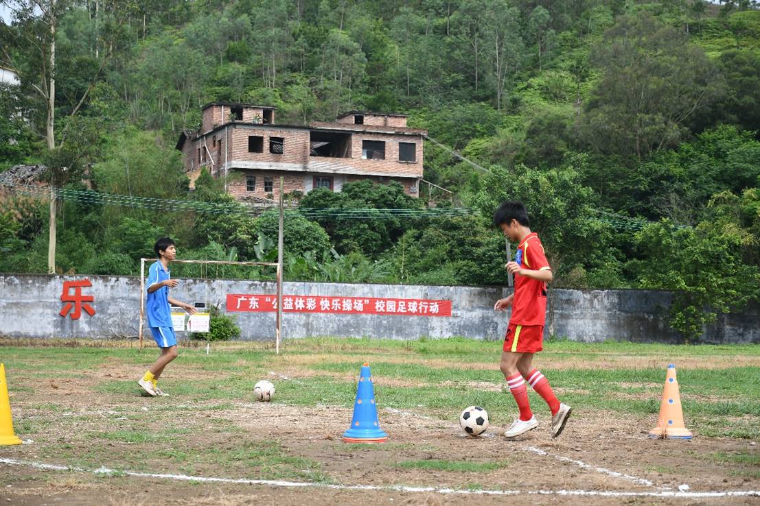 捐贈儀式結(jié)束后,一場校內(nèi)足球?qū)官惥噬涎?,對陣雙方為大都中學(xué)初一及初二的學(xué)生。雖然場地條件不佳,但在場上奔跑的小球員個(gè)個(gè)全情投入比賽,激情澎湃。身材并不高大的他們,球感細(xì)膩,傳接跑位靈活快速,傳承了南派足球優(yōu)秀理念。場上球員奮勇拼搏,場下觀戰(zhàn)的師生樂在其中,不時(shí)發(fā)出歡呼喝彩聲,這就是實(shí)實(shí)在在的快樂操場。