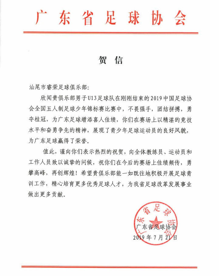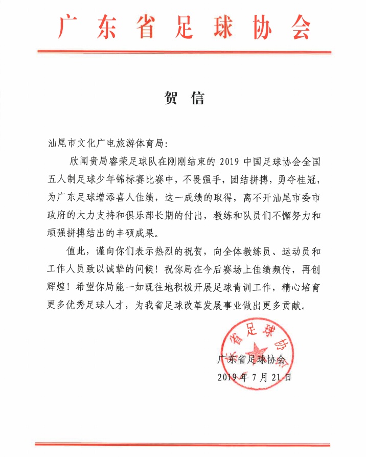 廣東省足球協(xié)會分別向汕尾市文化廣電旅游體育局、睿榮足球俱樂部發(fā)賀信。
