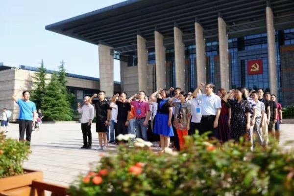 參觀完展廳,全體學員在講解員帶領下,來到廣場,拍著整齊的隊伍。全體黨員高舉右拳,跟著書記,以飽滿的熱情和昂揚的斗志重溫了莊嚴的入黨誓詞,在黨旗下接受了心靈的凈化和洗禮,抒發(fā)了對黨忠誠的意志和信念。