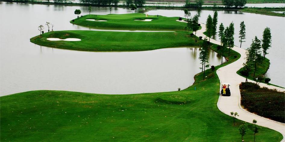 該球場(chǎng)是依據(jù)世界高爾夫職業(yè)比賽(PGA)標(biāo)準(zhǔn)設(shè)計(jì)建造的標(biāo)準(zhǔn)桿72桿的18洞高爾夫球場(chǎng),總占地面積1300畝,水占面積500畝,球道面積800畝,其中沙坑面積14134平方米。每洞至少5個(gè)發(fā)球臺(tái),50米高的天然坡度,6個(gè)島型果嶺,6個(gè)炮臺(tái)果嶺,72個(gè)沙坑,17個(gè)洞有水障礙環(huán)繞……