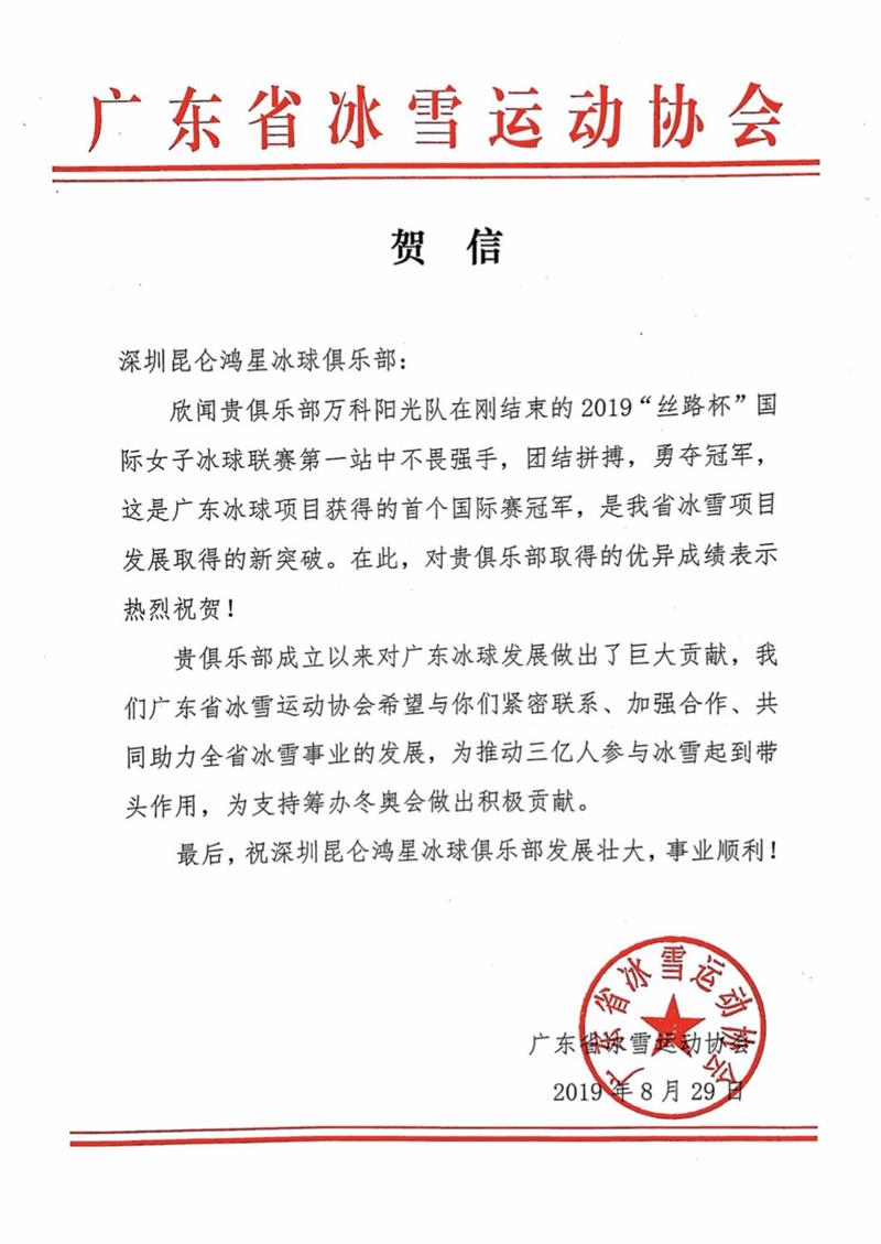 廣東省冰雪運(yùn)動(dòng)協(xié)會(huì)向深圳昆侖鴻星冰球俱樂(lè)部發(fā)出賀信。正文如下: