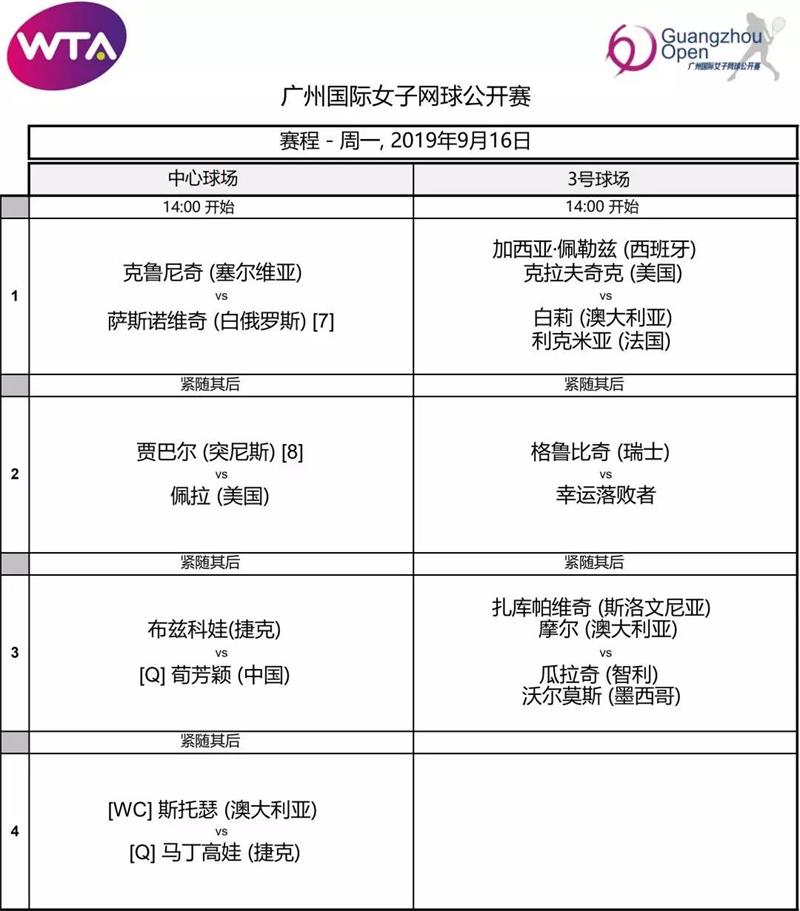 正賽第一日賽程同樣在今天揭曉,7號(hào)種子薩斯諾維奇與2017年賽會(huì)亞軍克魯尼奇之間的強(qiáng)強(qiáng)對(duì)話率先于北京時(shí)間下午2點(diǎn)在中心球場(chǎng)開(kāi)打。隨后進(jìn)行的是8號(hào)種子、突尼斯名將賈巴爾與美國(guó)球員佩拉的對(duì)決。從資格賽突圍的中國(guó)金花荀芳穎將迎來(lái)連續(xù)作戰(zhàn),對(duì)陣捷克小將、2019羅杰斯杯女單四強(qiáng)布茲科娃。壓軸亮相中心場(chǎng)的將是大滿貫單雙打得主、澳洲名將斯托瑟,她將迎來(lái)資格賽選手馬丁高娃的考驗(yàn)。