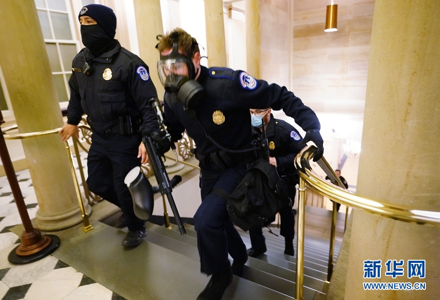 這是1月6日在美國(guó)華盛頓拍攝的國(guó)會(huì)警察緊急應(yīng)對(duì)闖入國(guó)會(huì)的抗議者的資料照片。新華社發(fā)(Pool圖片,凱文·迪奇 攝)