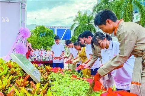 佛山市實(shí)驗(yàn)中學(xué)全校師生見(jiàn)證了這一重要時(shí)刻。其中,175名西藏學(xué)生穿著民族服飾參加活動(dòng),28名西藏學(xué)生與28名漢族學(xué)生兩兩結(jié)對(duì)進(jìn)行填土,象征祖國(guó)56個(gè)民族和諧團(tuán)結(jié)。此次用來(lái)填撒的泥土取自全國(guó)各地,由漢、藏學(xué)生從各自家鄉(xiāng)帶來(lái),讓培土儀式更具意義。