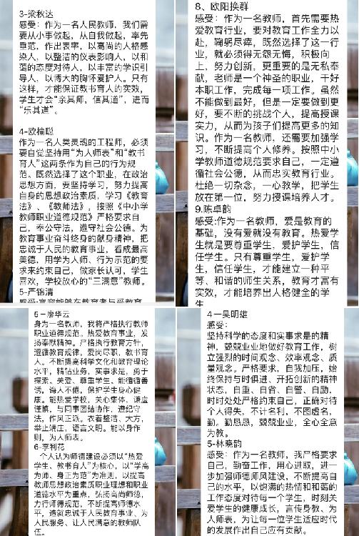 在本次的線上集體學(xué)習(xí)中,通過對(duì)8起典型問題的了解和反思,龍江城小全體教師深刻認(rèn)識(shí)到師德“紅線”不可逾越。在嚴(yán)守“紅線”的同時(shí),要謹(jǐn)記自己肩負(fù)的職責(zé)和使命,不斷錘煉教育報(bào)國之志,時(shí)刻堅(jiān)守為黨育人、為國育才初心,自覺堅(jiān)守精神家園、堅(jiān)守人格底線,率先垂范、以身作則,培養(yǎng)擔(dān)當(dāng)民族復(fù)興大任的社會(huì)主義建設(shè)者和接班人。