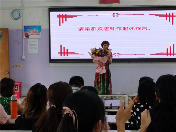 隨后,梁老師發(fā)表了退休感言。梁老師提及自己38年的教學(xué)生涯感慨萬千,她表示自己對教育事業(yè)有著深厚情感,對學(xué)校以及同事們也眷戀萬分。對學(xué)校領(lǐng)導(dǎo)的的重視與關(guān)懷,對同事們的陪伴與支持,她表示深深的感謝。