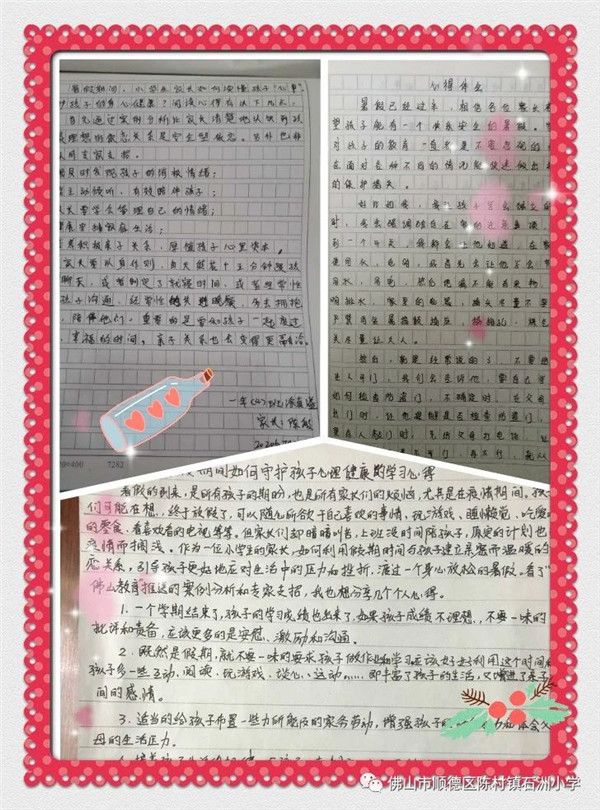 班主任們根據(jù)佛山市守護(hù)師生身心健康項目推送的小學(xué)系列專業(yè)宣傳推文,及時為家長送上最新鮮的資訊,指導(dǎo)家長履行職責(zé),暑假期間守護(hù)孩子的心理健康。家長們通過學(xué)習(xí)推文中的“案例呈現(xiàn)”、“案例解剖”、“專家支招”等內(nèi)容,為孩子營造溫馨祥和的家庭氛圍,有效地培養(yǎng)孩子的積極情緒,建立和諧的親子關(guān)系。