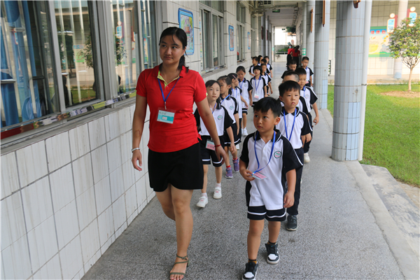 在熟悉校園環(huán)境中,新生們在老師的帶領(lǐng)下,一路認(rèn)教室、操場、廁所……以便更快更好地了解校園環(huán)境。一路參觀,老師們教給孩子們:進(jìn)辦公室要先敲門;要愛護(hù)綠化保護(hù)環(huán)境;如何上廁所,上完廁所要洗手;身體不舒服及時找老師……