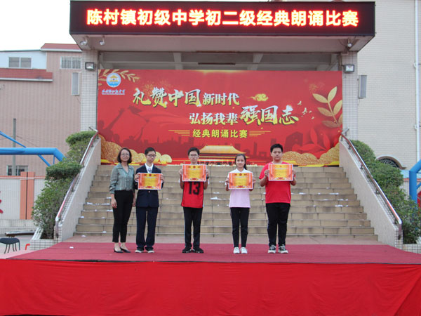 比賽結(jié)束后,語文科組長許淑蘭老師從朗誦的語音語調(diào)、作品理解、感情投入等方面作了全面的總結(jié)和精彩點評,給出了針對性的建議。她鼓勵同學(xué)們繼續(xù)努力,多讀好作品,陶冶情操,用真情演繹自己的風(fēng)采,從內(nèi)心抒發(fā)出對祖國優(yōu)秀文化的熱愛,展現(xiàn)新時期中學(xué)生的風(fēng)貌。并希望同學(xué)們要以本次比賽為契機,多讀好書,讀經(jīng)典之書,做一個書香之人。最后,由團委公布名次并組織進行了頒獎。至此,陳村鎮(zhèn)初級中學(xué)初二級舉辦的中華經(jīng)典朗誦比賽在同學(xué)們的熱烈掌聲中落下了帷幕。
