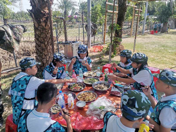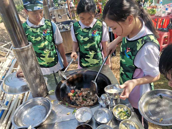 中午,在野外生存--田園野炊項(xiàng)目中同學(xué)們按照基地提供的食材完成野炊任務(wù)?;顒?dòng)中讓孩子體驗(yàn)戶外做菜的感覺(jué),讓孩子的動(dòng)手能力得到加強(qiáng),讓同學(xué)們理解媽媽在家做飯的辛苦,養(yǎng)成珍惜糧食的好習(xí)慣。