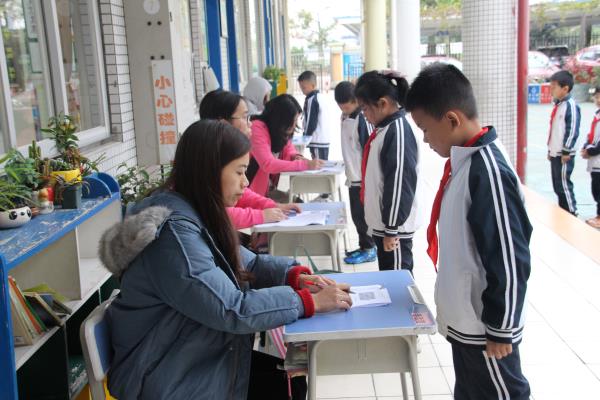 第二部分的考核在十六周一下午進(jìn)行,語數(shù)英三科同時(shí)考核。三至六年級的考核形式是三科綜合筆試,一、二年級則是通過各科組的評委老師到各班進(jìn)行現(xiàn)場口語考查。寒意驟至,考核活動卻是如火如荼地進(jìn)行著,三至六年級的學(xué)生們端坐在教室里奮筆疾書,一、二年級的小朋友們則在所有考核老師的組織下,有的在課室認(rèn)真聆聽故事;有的在老師指揮下排著整體的隊(duì)伍;有的在不同學(xué)科的老師面前奶聲奶氣地回答著各科的問題。稚態(tài)可掬的口述,還不忘禮貌地問好,配上那可愛的笑容,又是“素養(yǎng)”的另一道風(fēng)景。