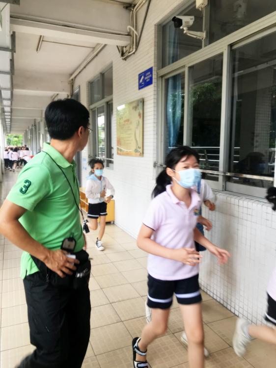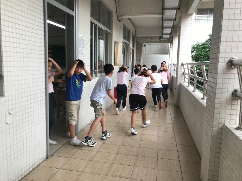 (各班主任帶領(lǐng)學(xué)生抱頭沿著指定路線快速疏散)
