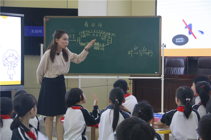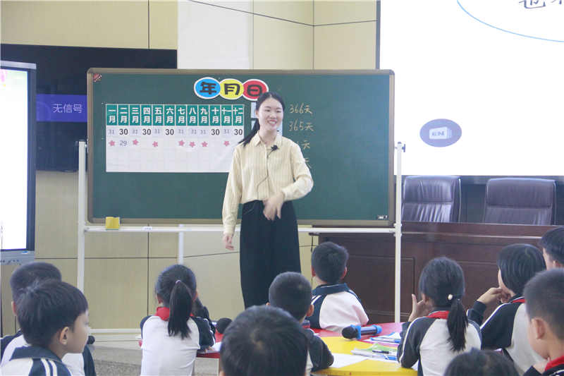 數(shù)學科先由我校的鄭華玲老師執(zhí)教《年月日》和沖鶴小學的夏慧琪老師執(zhí)教《看日歷》。鄭老師把學生帶回公元紀年的起點,讓學生經歷制訂、修訂古羅馬立法的過程,用古羅馬故事讓學生感受大小月、2月的制訂過程,加深學生的記憶。接著帶領學生在生動的具體情境中,將課本的學習知識恢復為原始的狀態(tài),重新探索計時單位大月小月的確立。同時,將數(shù)學文化巧妙融入學生的學習過程,調動學生的積極性,培養(yǎng)學生學數(shù)學的興趣。夏老師則用同學喜聞樂見的形式“找不同”引入課堂,在過程中努力地創(chuàng)設合作學習的模式,引導學生投入課堂學習。兩位老師都抓住了本課的教學重點,并將教學目標落實到位,各有特色。