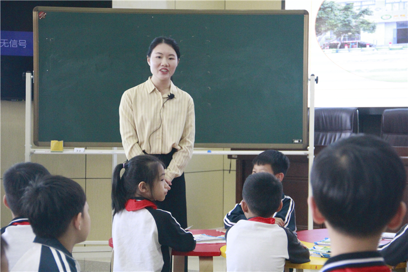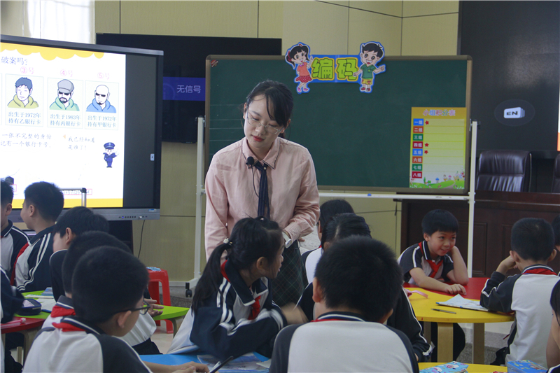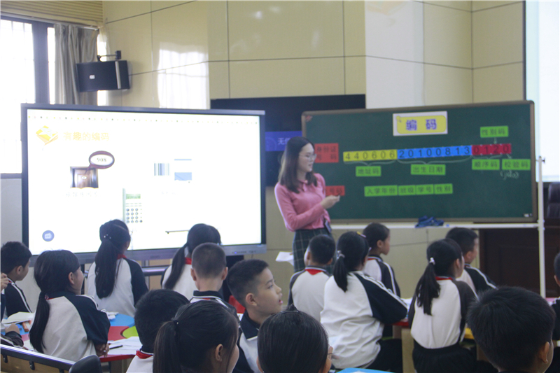 接著,由倫教小學的趙靈老師和昌教小學的陳煜老師分別執(zhí)教四年級上冊數(shù)學好玩中的《編碼》一課。趙老師將導入進行創(chuàng)造性地改編,用學生熟悉的電影導入課堂,吸引學生的注意。陳老師則將靜態(tài)的內容轉化為動態(tài)的探案過程,將學生拉近課堂,激發(fā)學生的探究欲望。