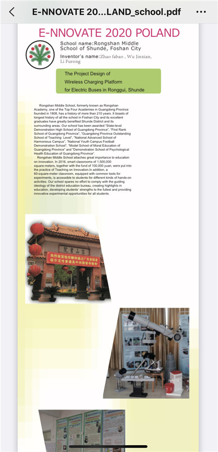 2020年7月6日-8日,受新冠疫情影響,全球首創(chuàng)的虛擬創(chuàng)新博覽會――波蘭“E-NNOVATE”2020在虛擬展臺上盛大開啟,通過在虛擬展臺上展示參加者的創(chuàng)新發(fā)明作品,并進行網上評審及給予公眾投票,讓世界各地的發(fā)明界朋友一起分享。 我校趙發(fā)寶、李富榮、吳靖賢等三位同學的創(chuàng)新參賽作品《順德容桂電動公交車無線充電站臺設計方案》斬獲“E-NNOVATE”2020國際發(fā)明展金獎。