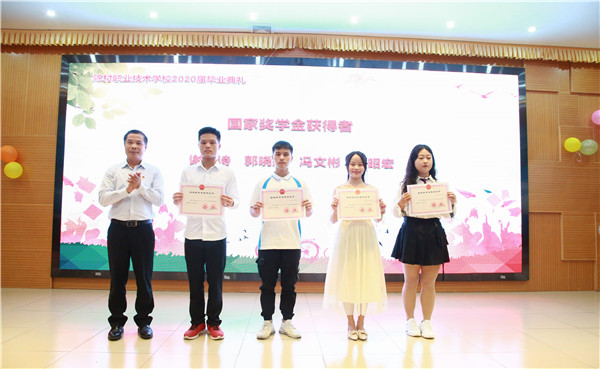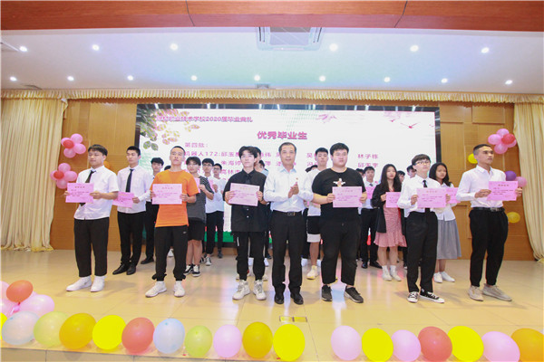 第三篇章:表彰篇。經(jīng)過(guò)學(xué)校三年的培養(yǎng),涌現(xiàn)出一批品學(xué)兼優(yōu)、全面發(fā)展的優(yōu)秀學(xué)子,學(xué)校對(duì)獲得國(guó)家教學(xué)金的陳景詩(shī)、郭曉彤、 馮文彬、陳昭宏同學(xué)和黃文慧等94名優(yōu)秀畢業(yè)生進(jìn)行表彰,四位校領(lǐng)導(dǎo)為他們頒發(fā)榮譽(yù)證書,勉勵(lì)畢業(yè)生在日后的學(xué)習(xí)或工作崗位上不驕不躁,砥礪前行,創(chuàng)造更加優(yōu)異的成績(jī)。