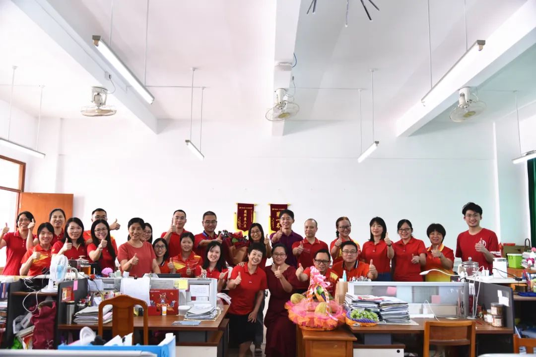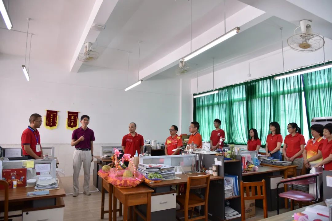 區(qū)領導與我校行政在成功門前留影,預祝中考勝利!在白建元副校長及陳水繹副校長等的陪同下,張毅副局長一行來到初三教師辦公室為初三老師送上寓意“碩果累累”的夏日水果及寓意“大紅大紫、好事連連”的鮮花,并與老師們進行親切交流。