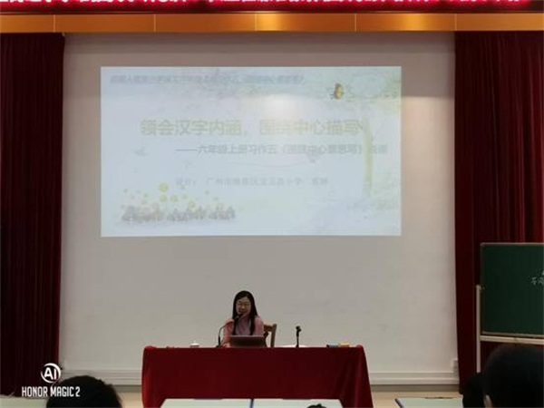 此次培訓分為上下午兩場。上午是由順德區(qū)教育發(fā)展中心的教研員林雪玲老師給老師們帶來精彩的講座――《學科核心素養(yǎng)下小學語文教學評一體化的思考與實踐》。林雪玲教研員從“樹立正確的語文觀”、“語文課堂教學探索”、“語文教學評價探索”三個方面展開培訓,講解了語文學科核心素養(yǎng)的含義和要求,要求教師應與時俱進,轉變觀念去理解語文綜合效應,樹立正確的語文觀,同時通過各種實際課例,結合教材和目標,有針對性地講解了如何進行“單元整體教學”,教會學生用方法、總結方法,使學生形成語文綜合素養(yǎng)和能力。最后探討了語文教學評價的依據和重要抓手,我們需要依據課標制定評價內容和評價標準,梳理語文要素,研究習題系統(tǒng),思考命題指向和未來努力的方向。林老師相信在座的老師一定能“整體統(tǒng)籌 前后勾連 聚焦目標 層層推進”用好統(tǒng)編語文教材。