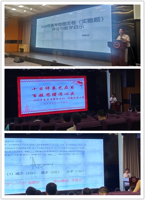 三位老師分別從2020年高考物理全國1卷的實驗題22、23題,計算題24、25題、選修題33題的改卷情況與全體教師分享交流。從解題過程到錯因分析,從得分情況到解題規(guī)范,從改卷心得到教學(xué)啟示,都做了非常詳盡的闡述,與會教師表示獲益匪淺。