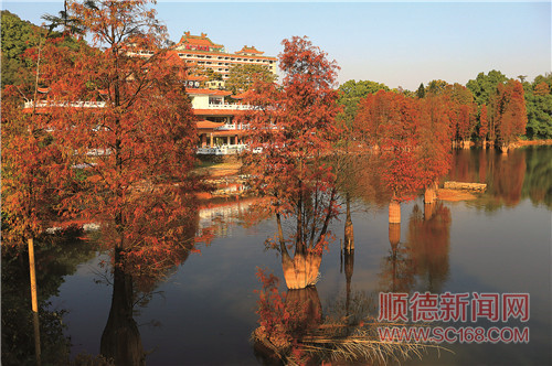 游客和攝影愛好者在仙泉酒店對開湖邊拍攝與欣賞水杉美景。
